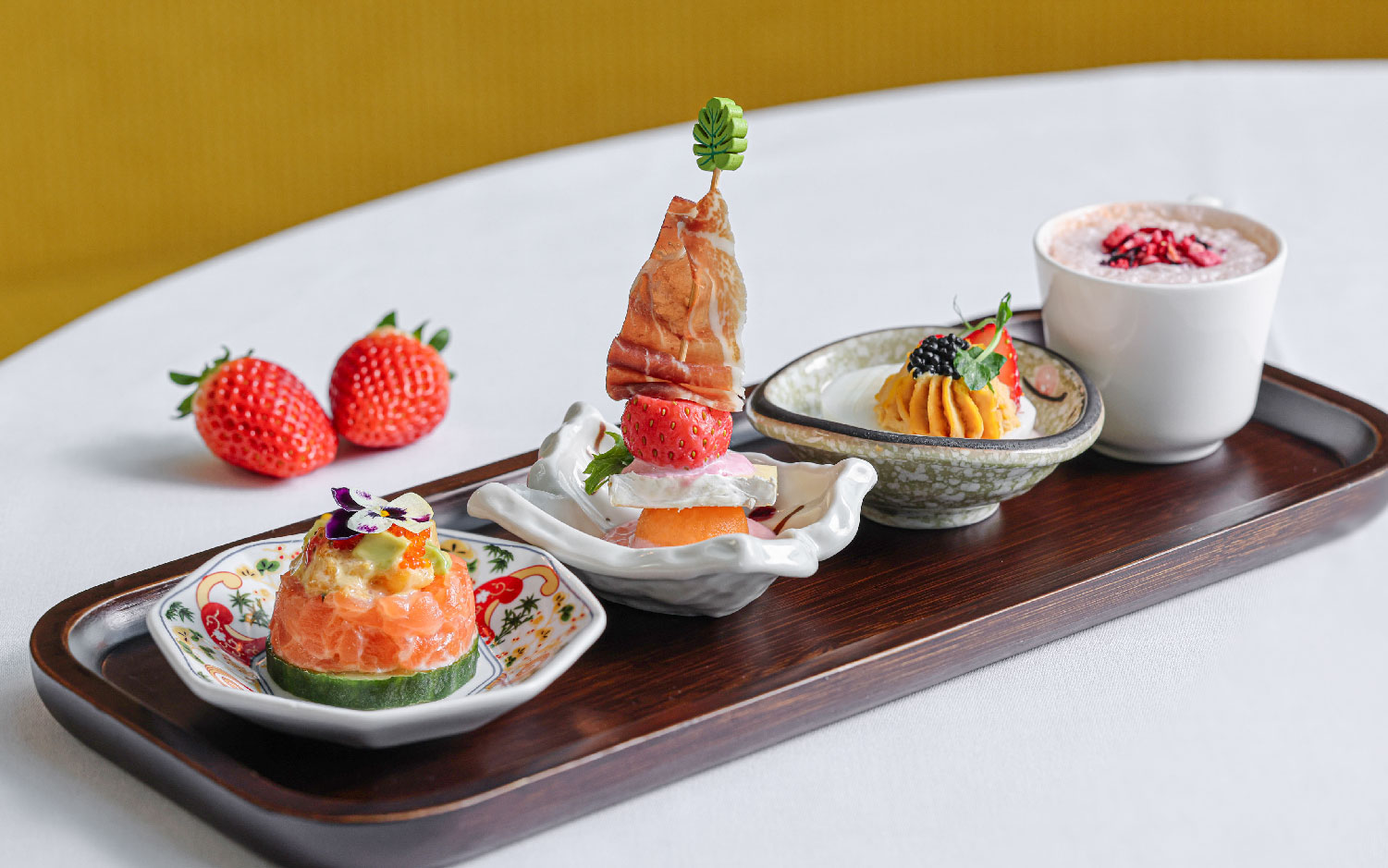 在这段下午茶旅程中,您将细味士多啤梨的多重魅力。由精致前菜揭开序幕后,您将品尝五粒来自日本五大知名县份的名种士多啤梨,每一粒皆蕴含季节限定的甜蜜芬芳,独特果香在口中绽放。