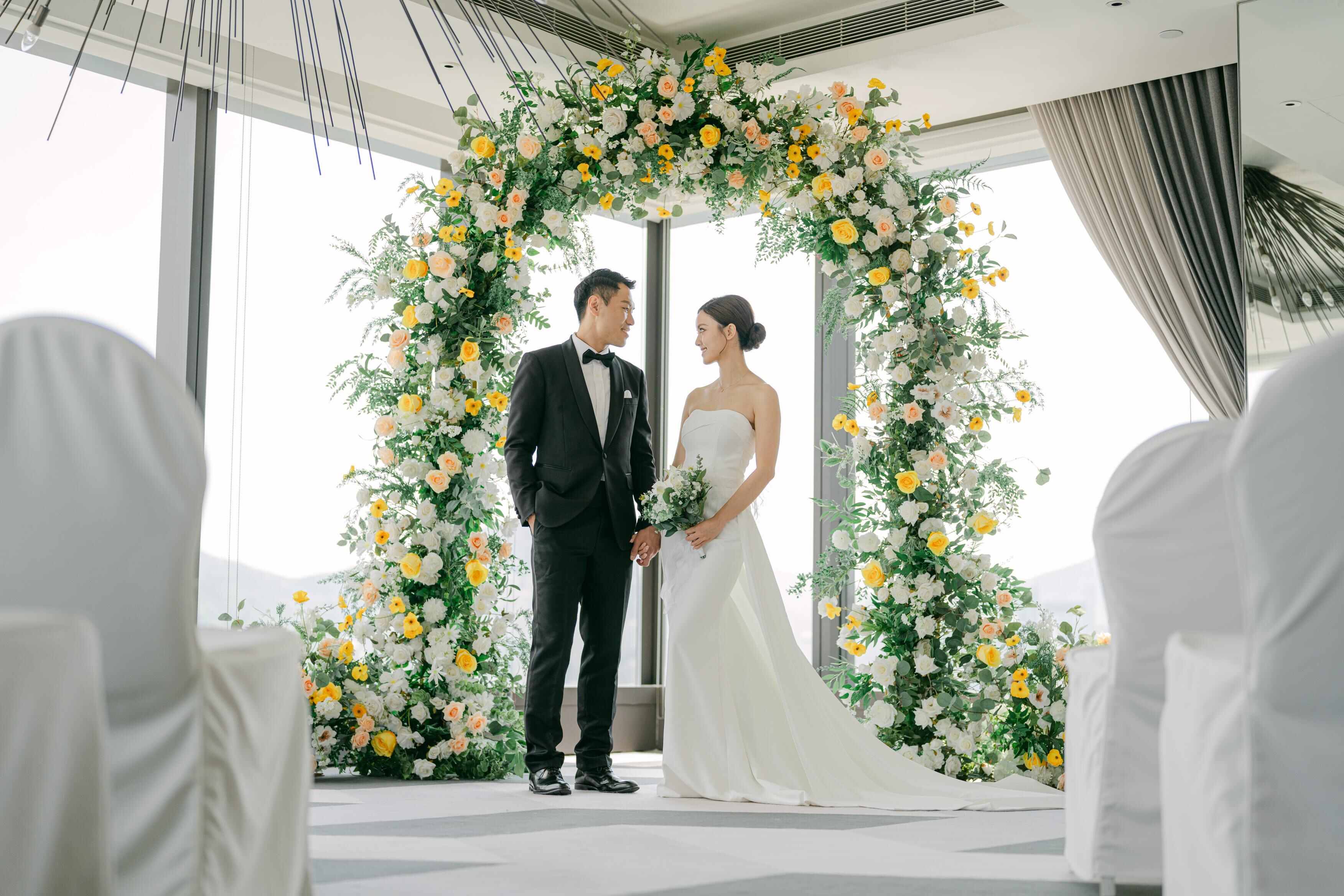 唯港荟现正推出五十位或以下的精品婚礼套餐,让您俩以优惠价港币38,888元起于28楼的私人贵宾厅举办简单而隆重的证婚仪式。证婚优惠套餐已包括双人入住CLUB 65海景套房一晚,并享用我们为您们精心准备的香槟、精美水果盘、花束及The Market 的双人早餐。