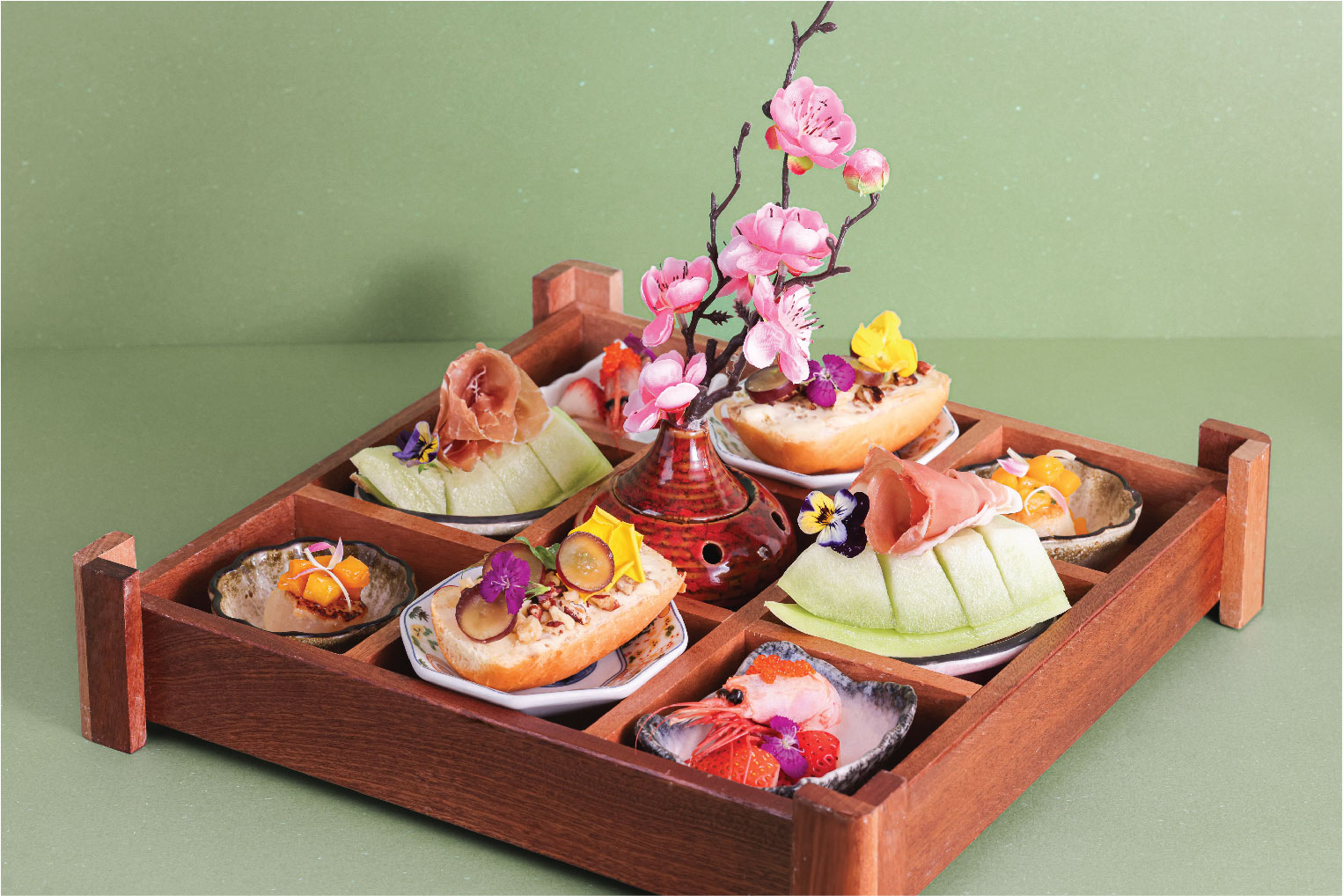 这次甜品部分采用和式九宫木盘,以盛载利用日本水果制作的精致甜点,配以烟雾效果,让您仿如置身于日本果园仙景之中。每位食客更可无限品尝北海道牛乳蜜瓜新地,采用了时令的北海道赤肉蜜瓜及北海道牛乳制成,口感软滑,果香十足!食客可按照个人喜好加入不同配料,制作出独一无二的日本新地杯!