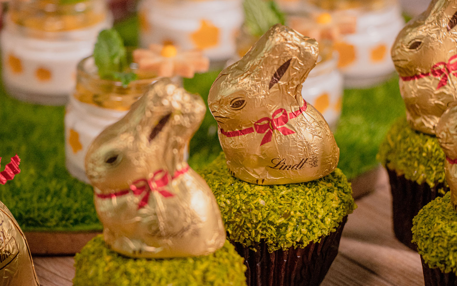 行政總廚何偉誠師傅和糕餅團隊精選66%黑朱古力、開心果及自家製杯子蛋糕,打造復活節限定的「開心果復活兔朱古力杯子蛋糕」。
